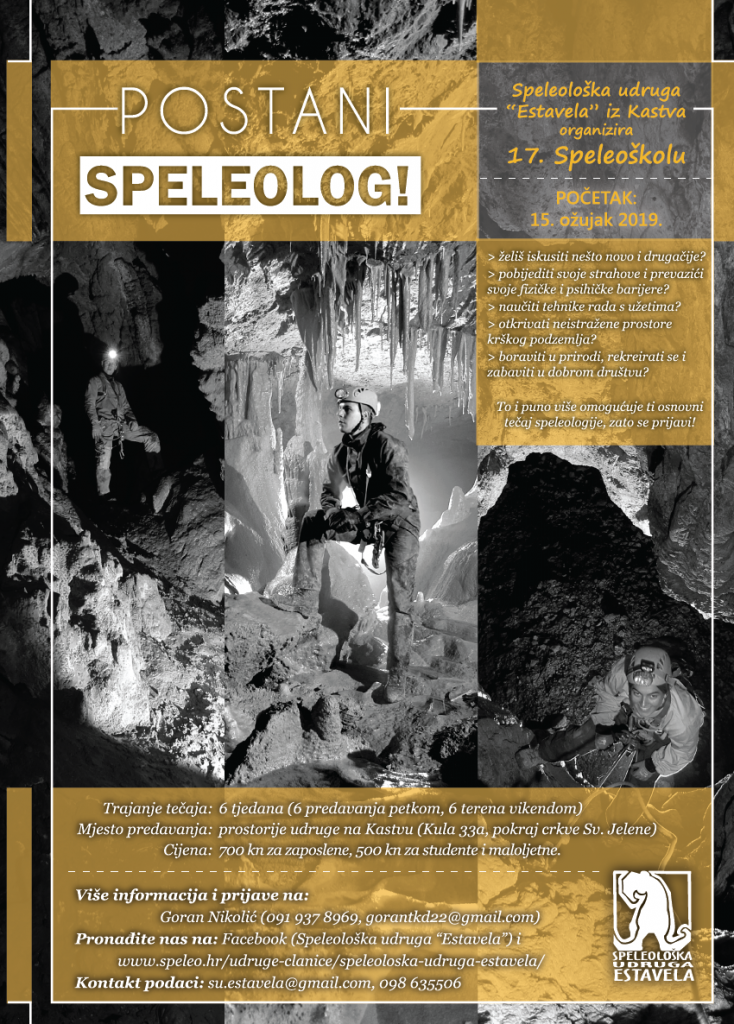 Na speleološku školu se mogu prijaviti svi stariji od 15 godina, nije potrebno nikakvo predznanje. Svu speleološku opremu i literaturu osigurava Udruga, potrebno je imati samo želju i volju za upoznavanje sa speleologijom te gumene čizme ili gojzerice, rukavice i radnički kombinezon. Škola počinje u petak 15.03.2019., zainteresirani se trebaju prijaviti do ovog roka jer je broj polaznika ograničen. Škola traje okvirno do 21.04.2019. Cijena škole je 700 kn, a za studente i maloljetne 500 kn.