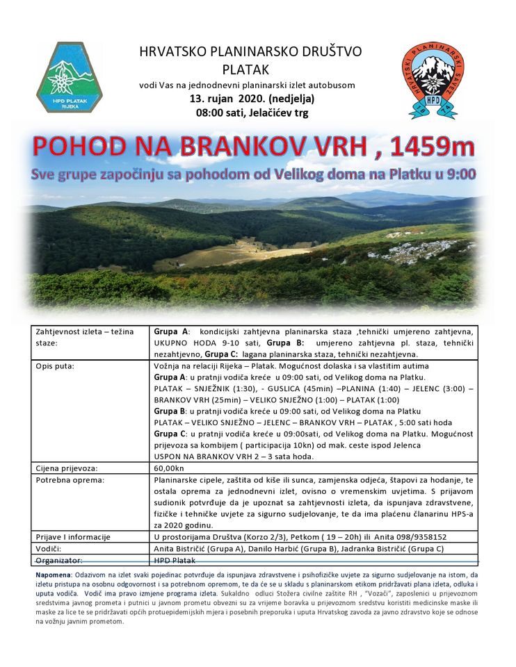 Pohod na Brankov vrh 13.9.2020, zbog najnovijih mjera Stožera Civilne zaštite jedinice lokalne samouprave, održat će se samo i isključivo za članove planinarskih društava Riječkog planinarskog saveza uz pridržavanje epidemioloških mjera samozaštite. Autobus je otkazan i dolazak na pohod je moguć osobnim automobilima.