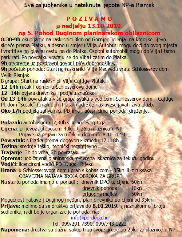NAPOMENA: Odazivom na izlet svaki pojedinac potvrđuje da ispunjava zdravstvene i psihofizičke uvjete za sigurno sudjelovanje na istom, da prihvaća ovaj program, da izletu pristupa na osobnu odgovornost te da će se u skladu sa planinarskom etikom pridržavati plana izleta, odluka i uputa vodiča. Organizator zadržava pravo izmjene programa izleta obzirom na objektivne